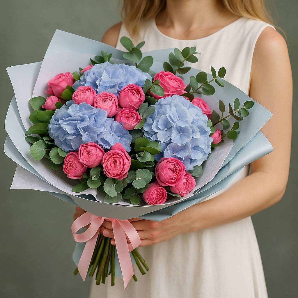 Букет «Лазурный рассвет» — нежная композиция в свежей палитре голубого и розового. Великолепное сочетание гортензий и пионовидных роз создаёт атмосферу романтики и гармонии. Такой букет станет идеальным подарком для выражения самых искренних чувств.