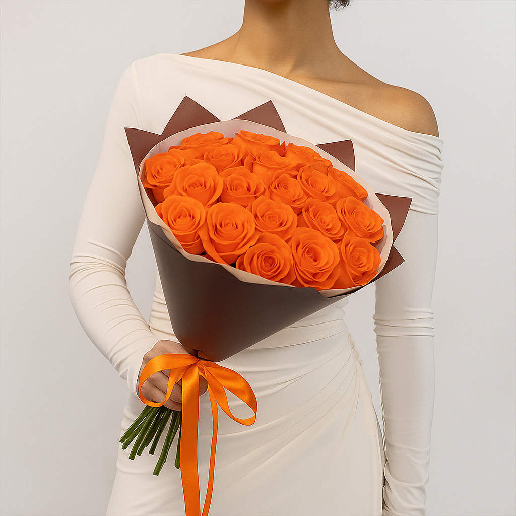 Яркий и страстный букет из оранжевых роз станет выразительным подарком для особого случая. Его насыщенный цвет поднимет настроение и подчеркнёт искренние эмоции. Такой букет дарит тепло и энергию, превращая обычный момент в настоящий праздник.
